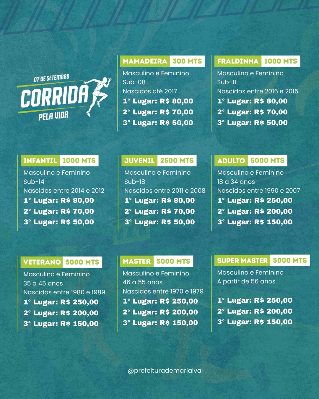 A Corrida pela Vida será realizada no domingo, 07 de setembro, com largada às 7h30 na Praça Madre Rafaela Ybarra (atrás da Prefeitura). Serão 537 atletas inscritos em várias categorias, desde a Fraldinha até o Super Master.